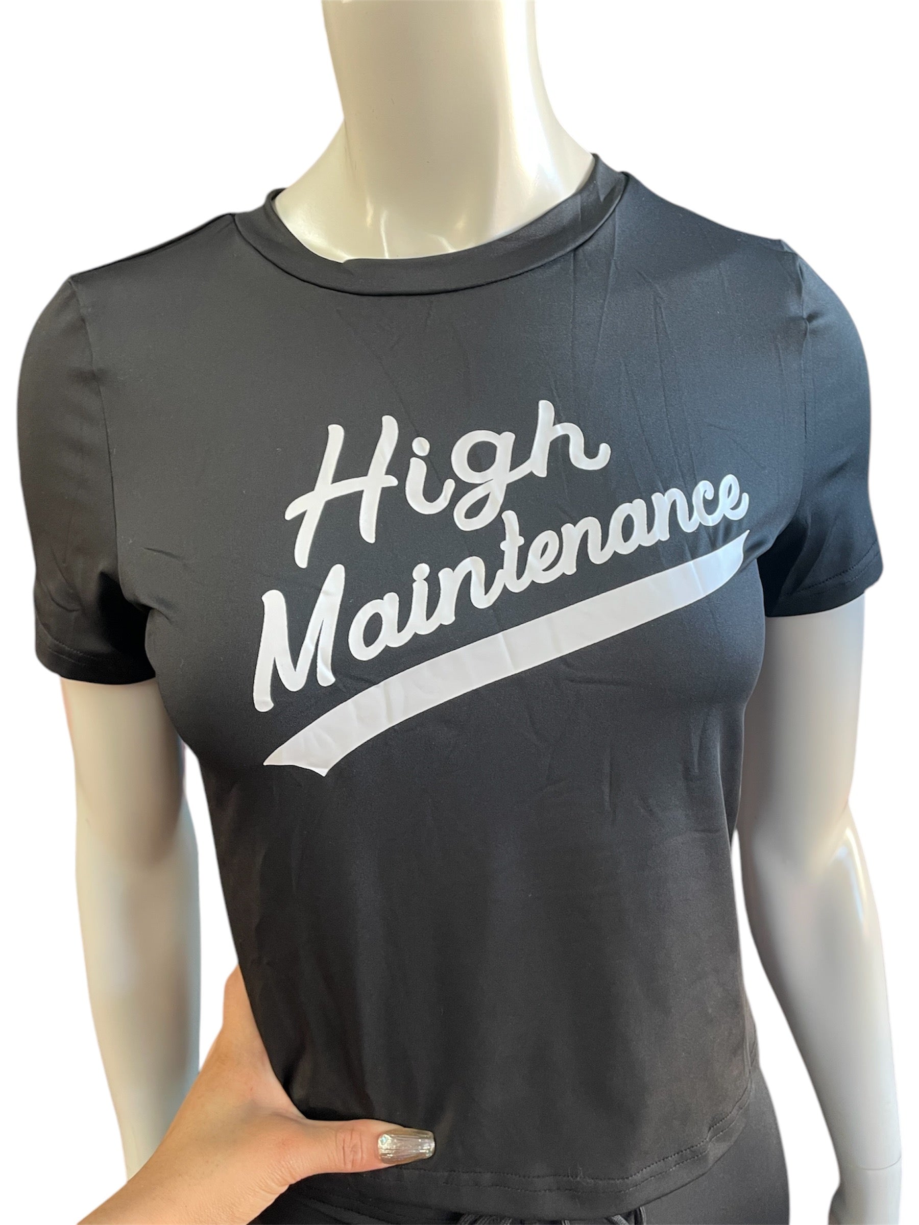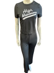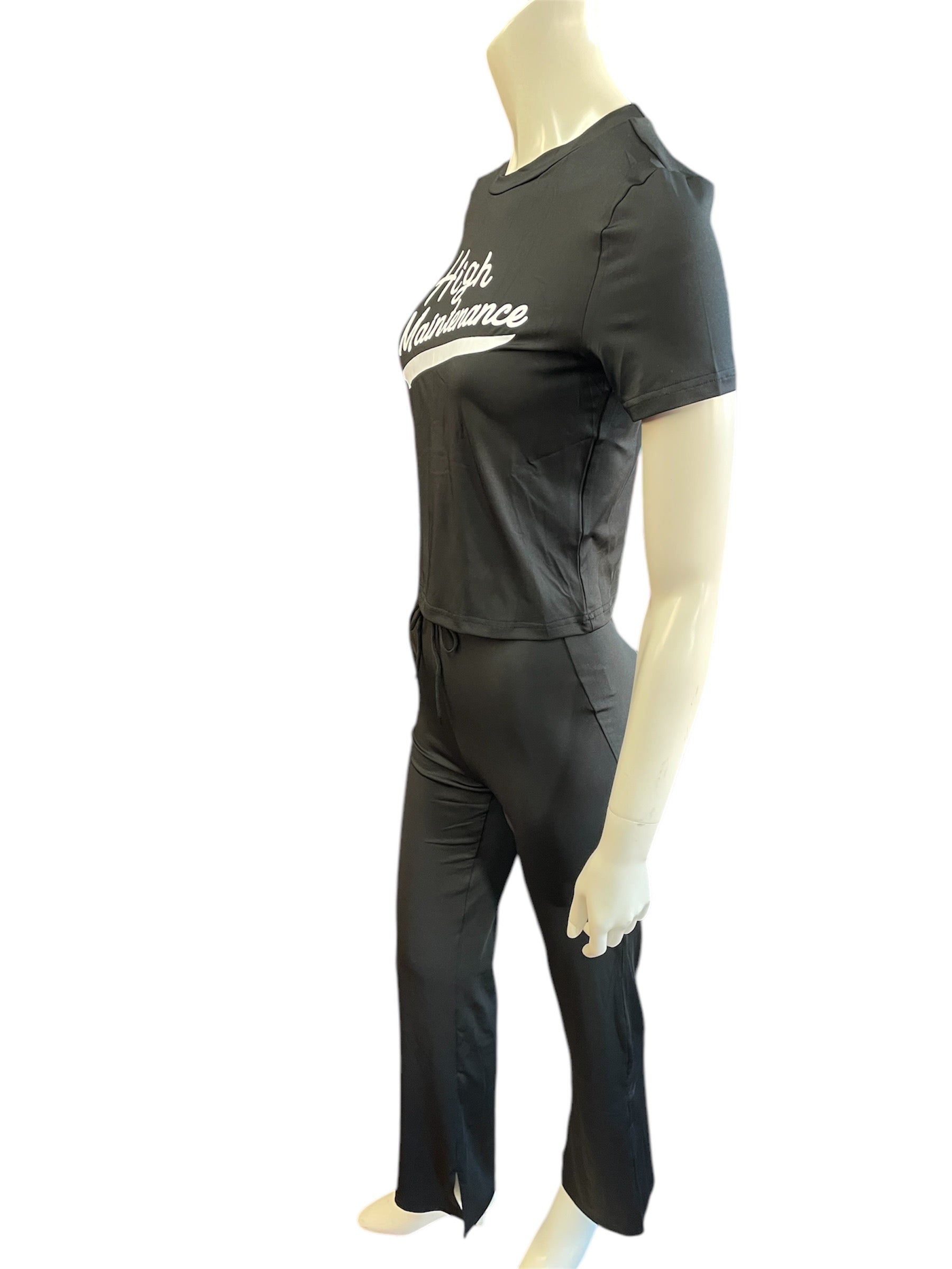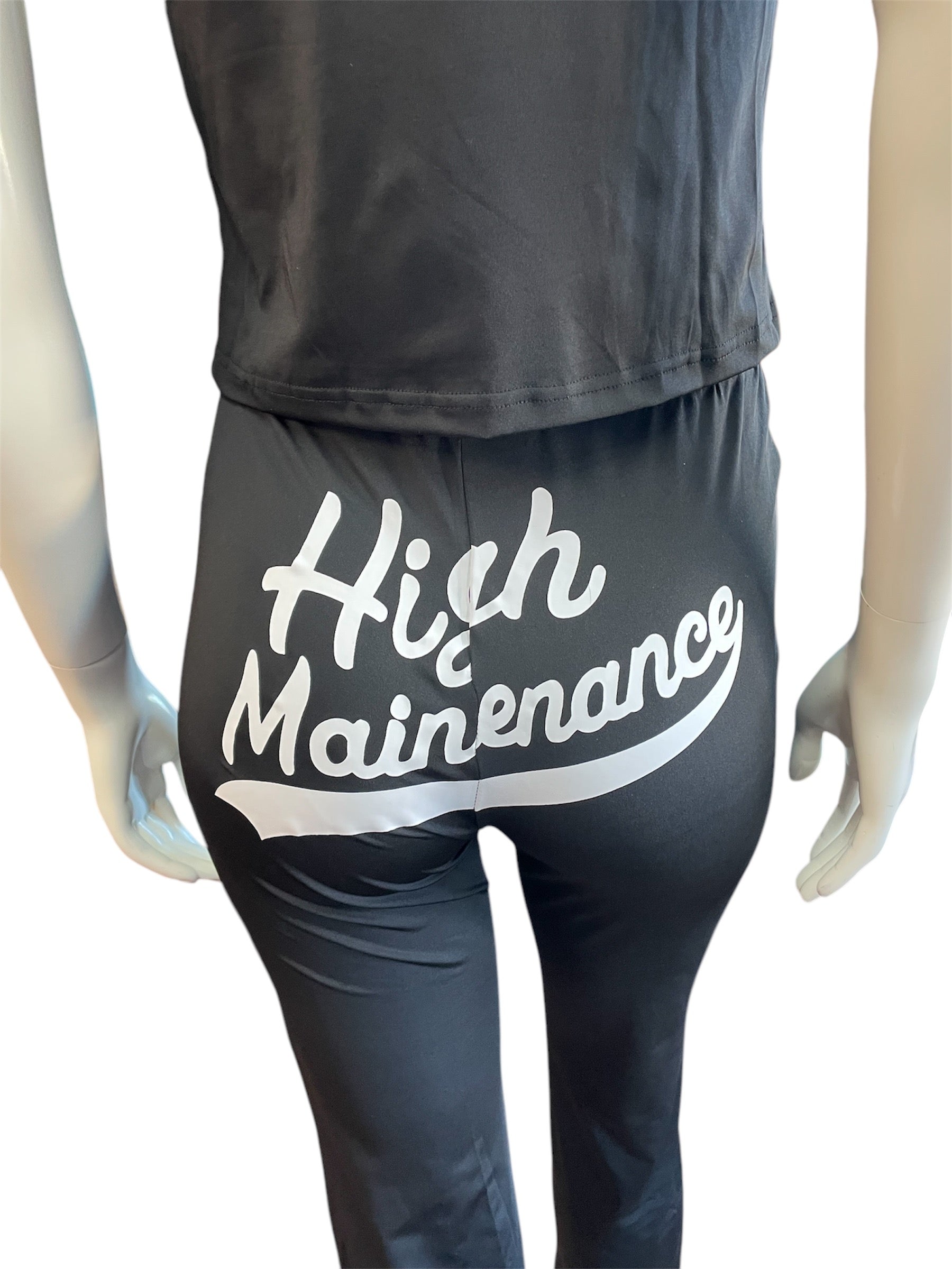 High Maintenance Lounge Wear Set. Soft and comfortable material. Pants are high waisted and fitted at waist and flared at the ankle. Draw string adjustable pants.