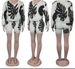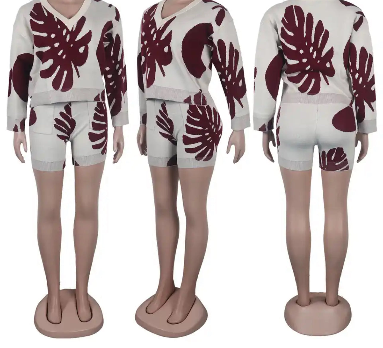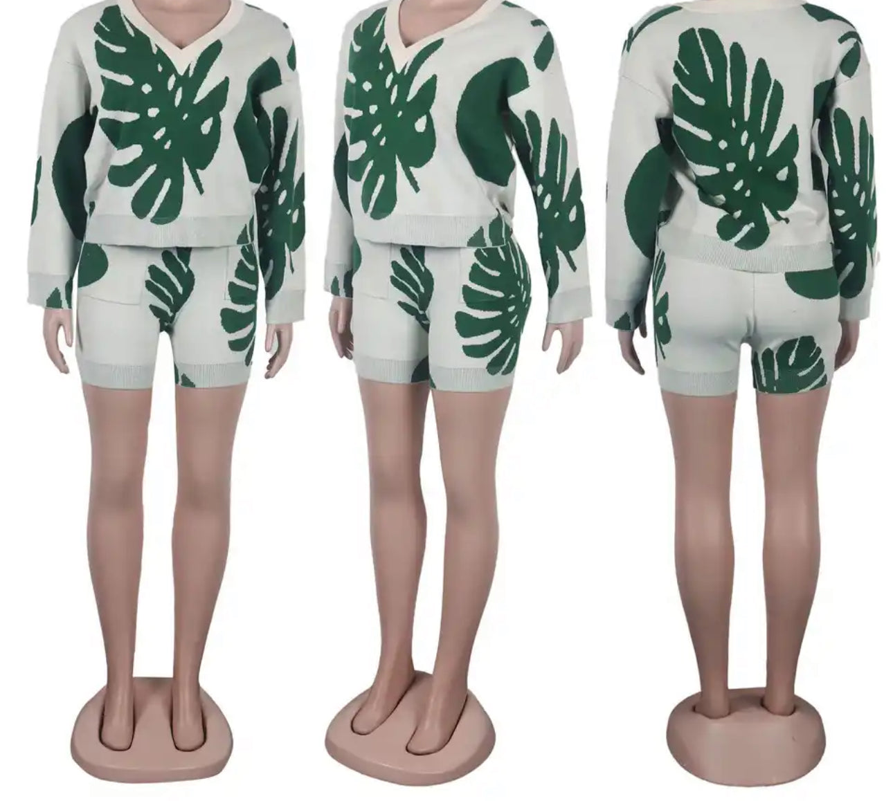 Women's 2 piece long sleeve sweater and elastic waistband shorts set. Leaf outfit is soft, breathable, knitted material, high stretch material, and the shorts have pockets.