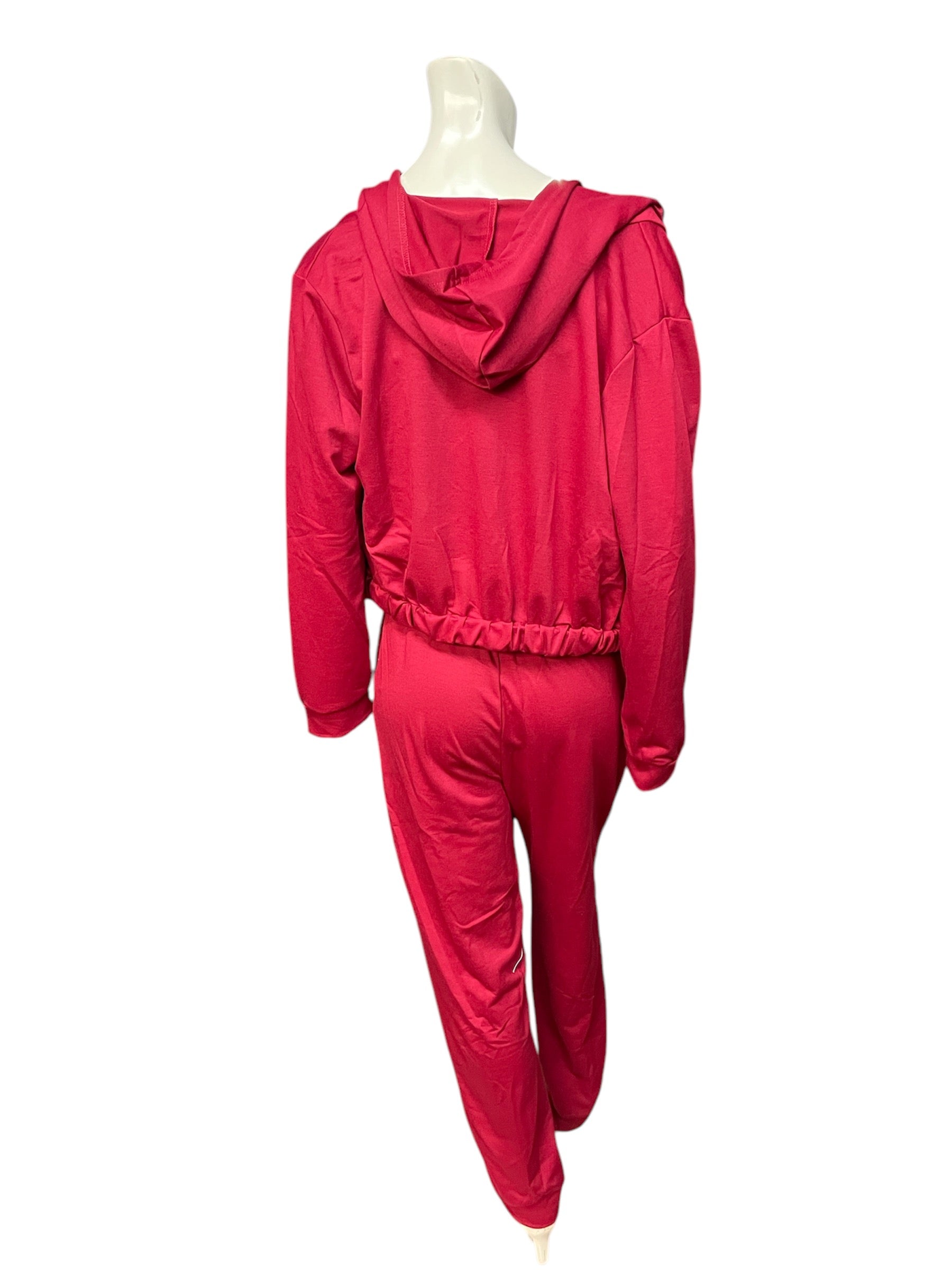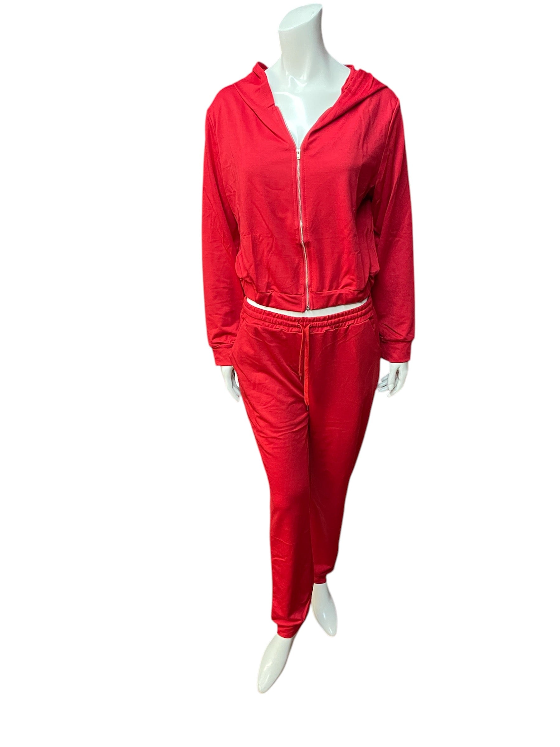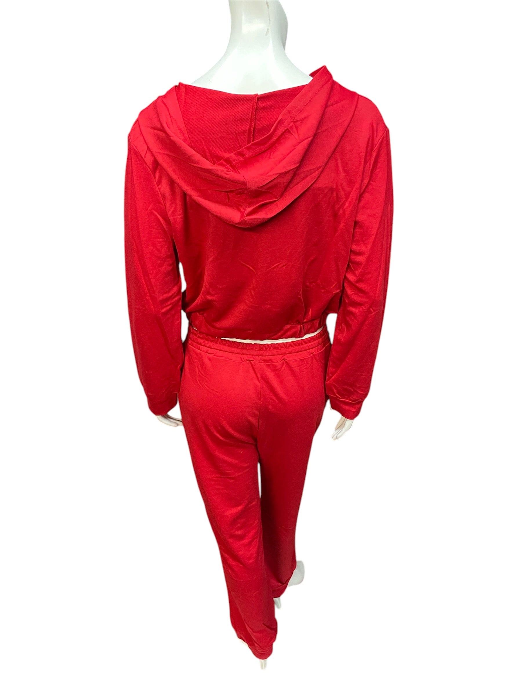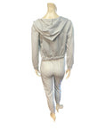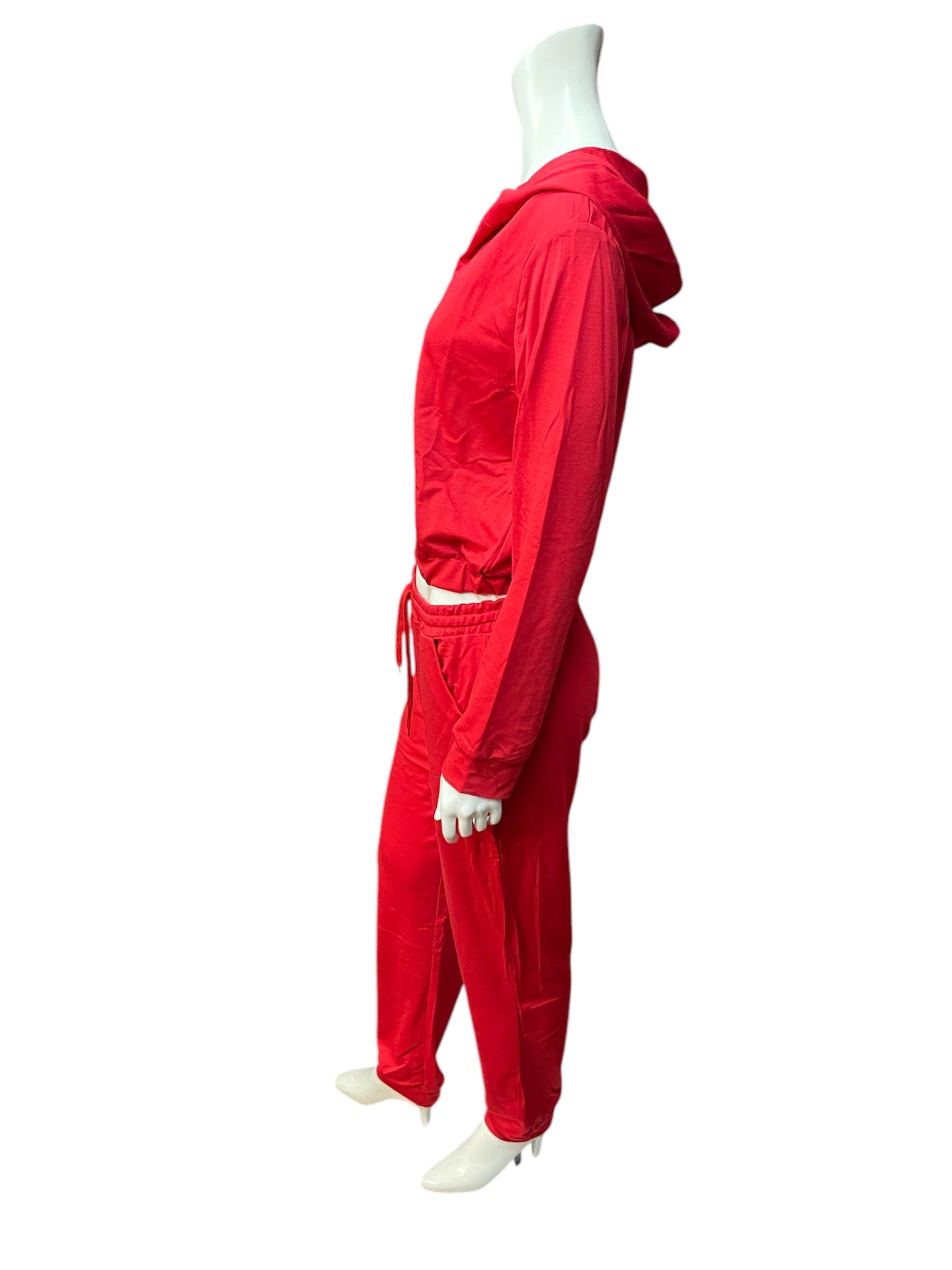 The crop top has spaghetti straps and no draw strings for the hoodie. The pants have pockets. It is a zip up jacket and it has a hoodie and is a fitted crop top styled jacket. The pants are draw string adjustable, and they are fitted at the ankle as well. Very Comfortable and soft.