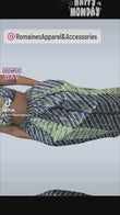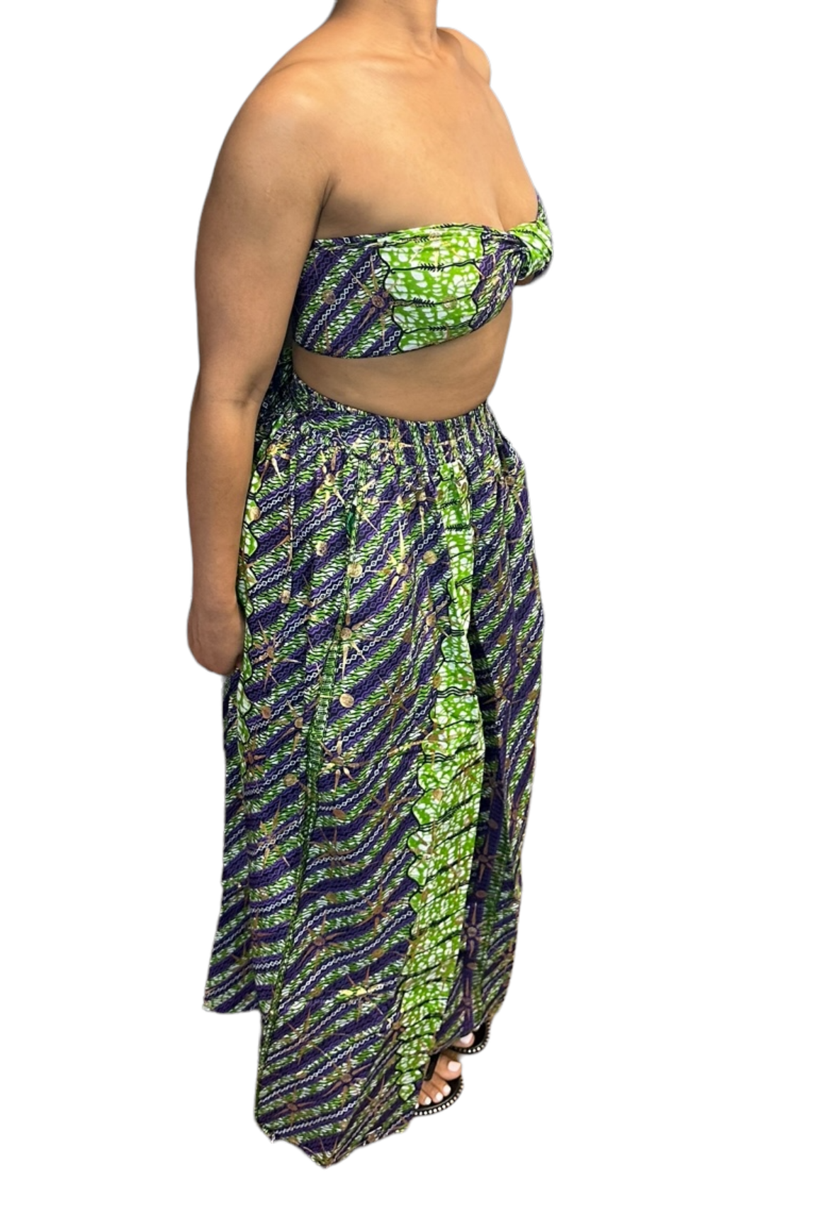 This long skirt has an elastic waist band, and has a waist tie that can be tied in the back, side, or back. This skirt is 100 % Cotton