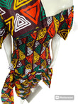 This African 2 Piece Skort Set has an dark brown base. Patterned with yellow, black, green, and white coloring. There are Pants inside the skirt. The skirt has a slit in the front, which show cases the pants. The skirt has an elastic waist and waist tie. Not detachable. Comes with head wrap.