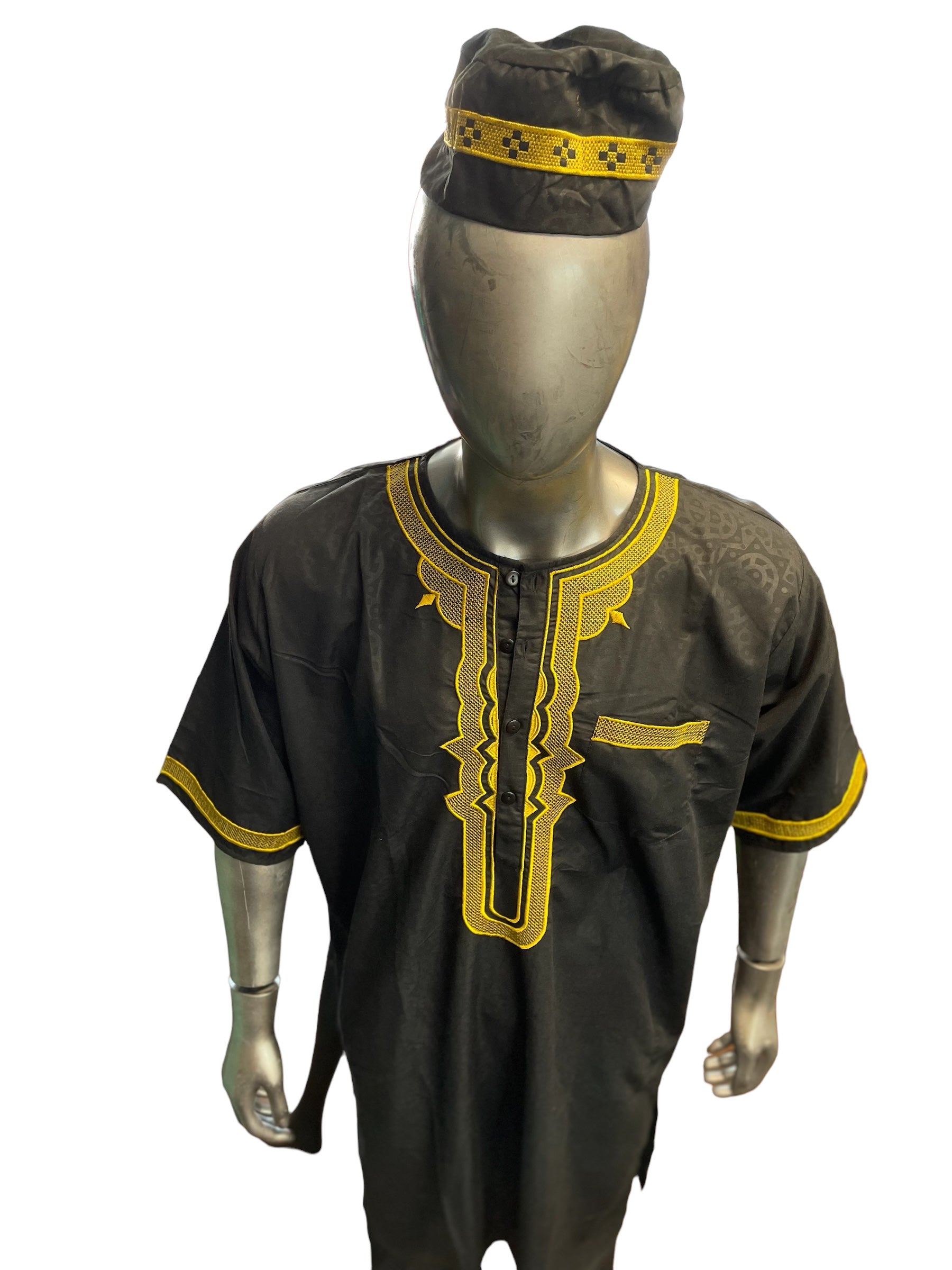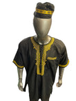 This Black Panther African Dashiki 3 piece set comes with the top, pants, and a hat. The pants have an elastic waist band, and pockets on each side. The top has pockets on both sides, as well as a front pocket on the right chest area.