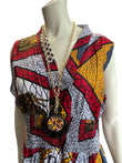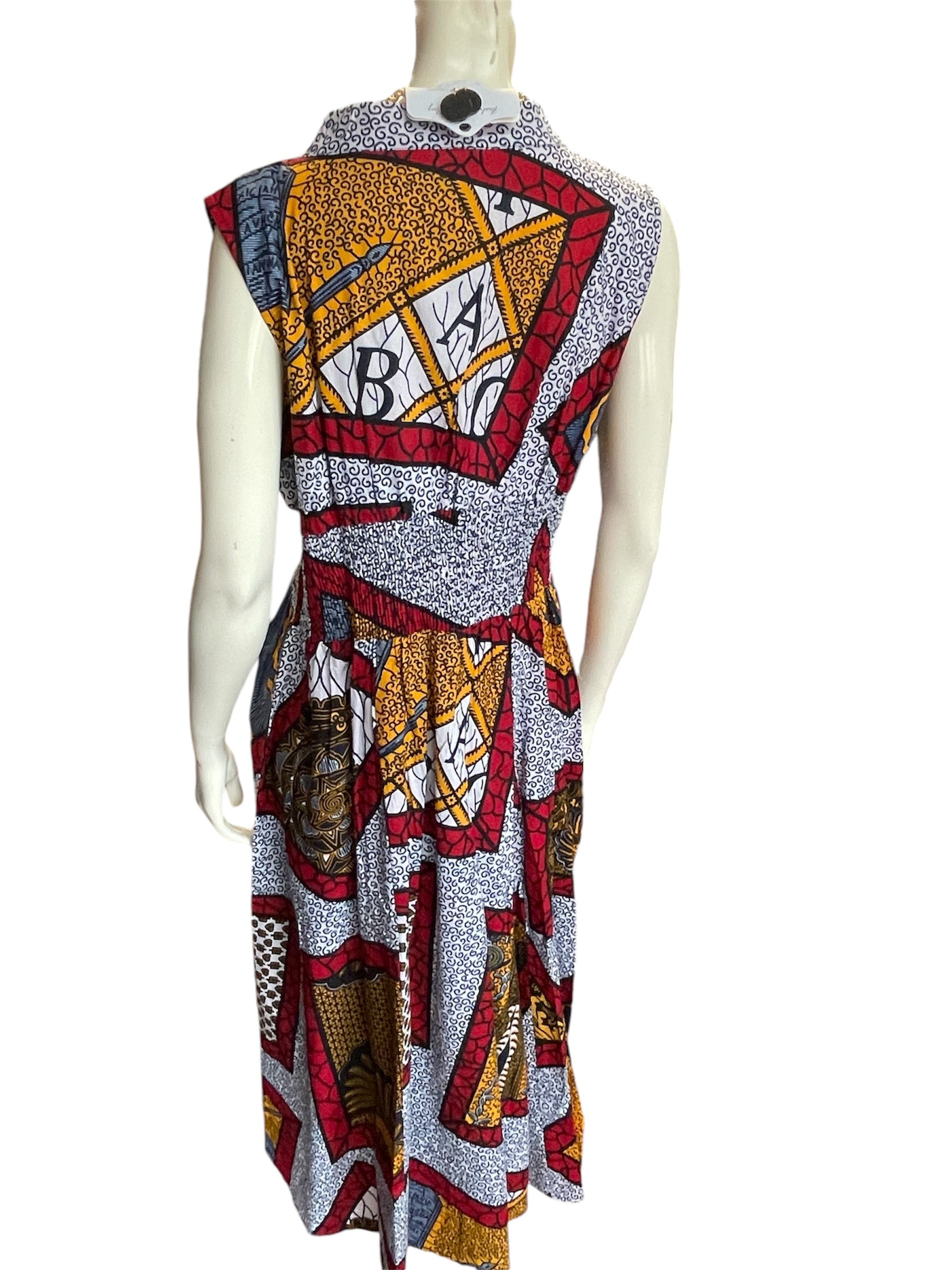 This dress is a long dress, it is sleeveless, and it comes with a matching head wrap. Covered with geometric patterns, and cinches at the waist. The dress is a PLUS free size.