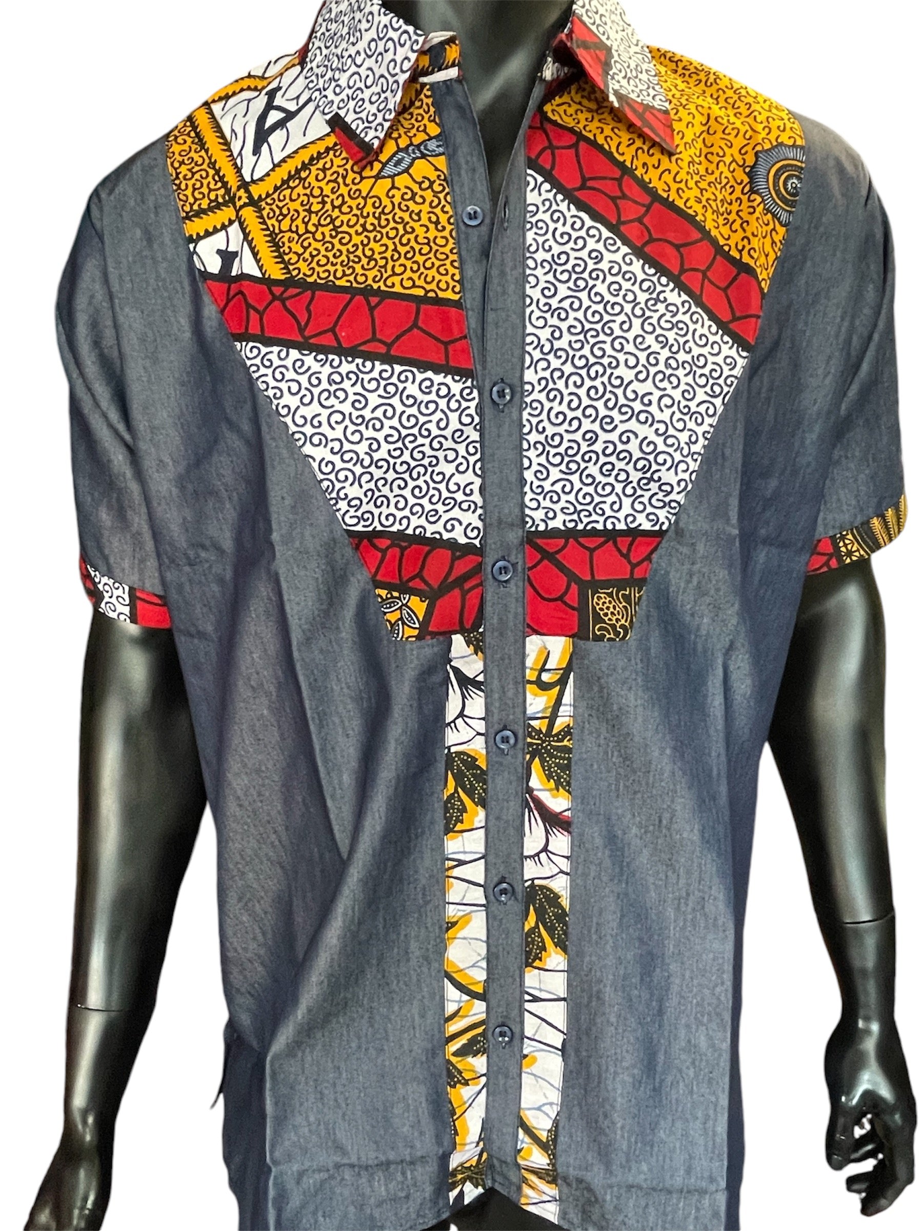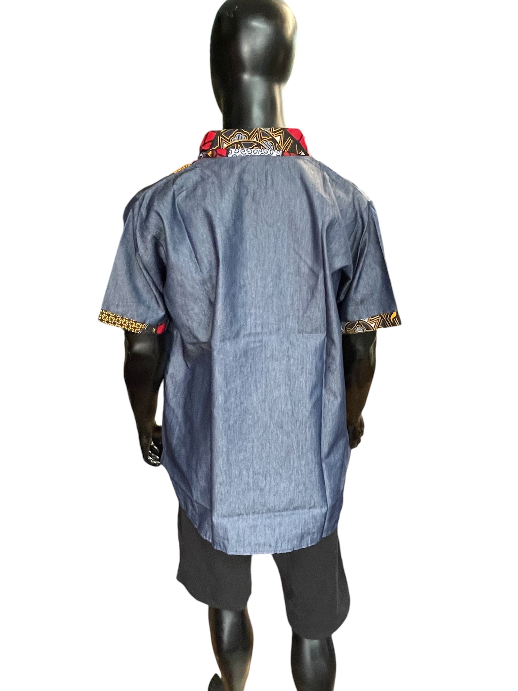 Men's African Jean shirt. There are no pockets on the shirt. The shirt is made of 100% Cotton. Care instructions are the same as the dress. This shirt can be dressed up or down. The shirt is a PLUS Free Size.