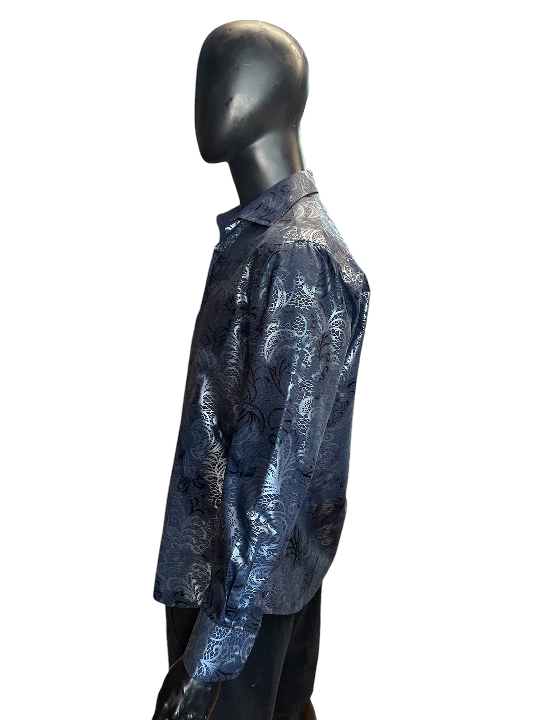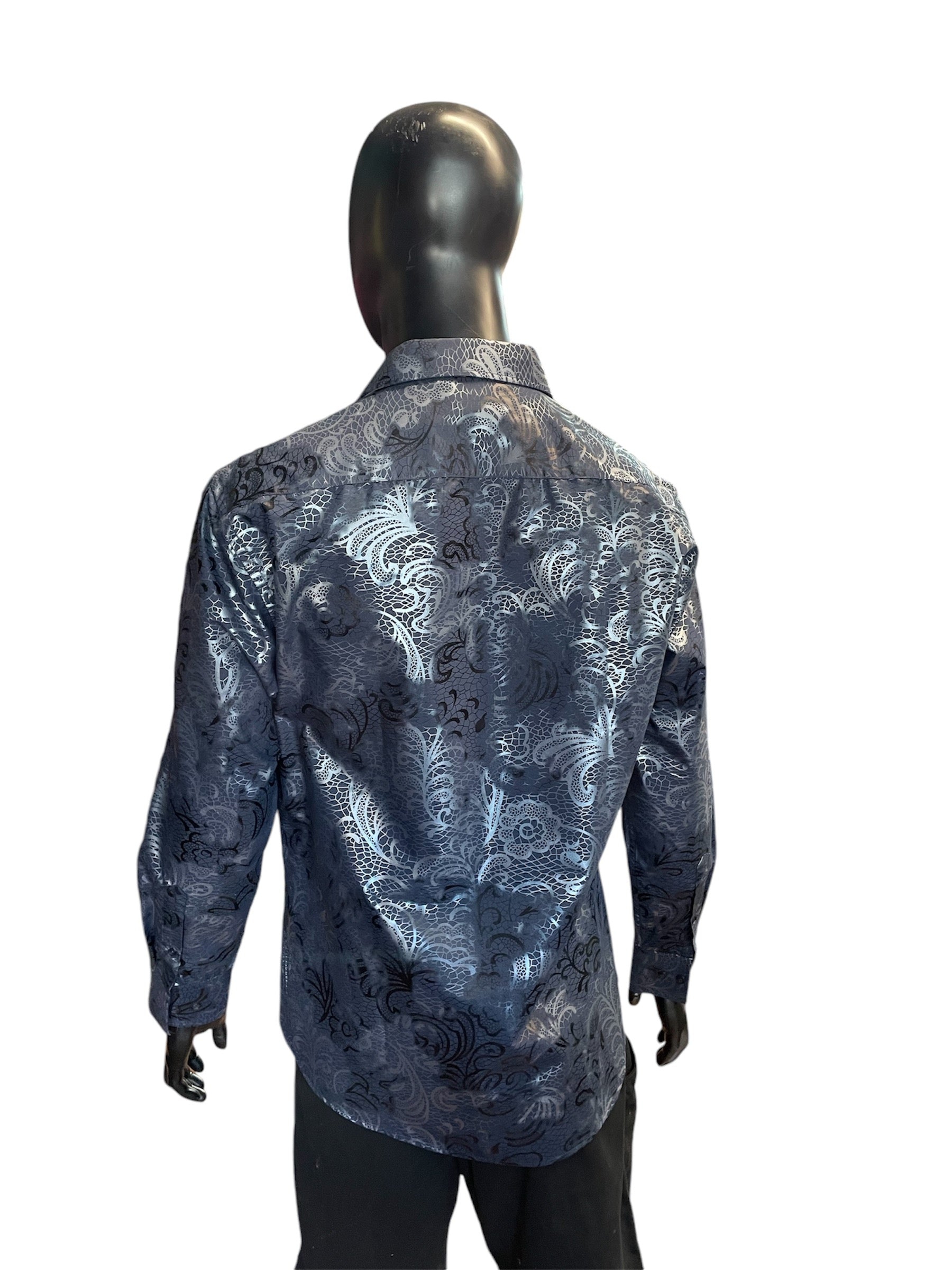 This men's button up dress shirt can be dressed up or down. It does not have a shirt pocket. It also is 100% cotton, and it is a size Large. This is a high quality dress shirt. Please make sure to follow the care instructions