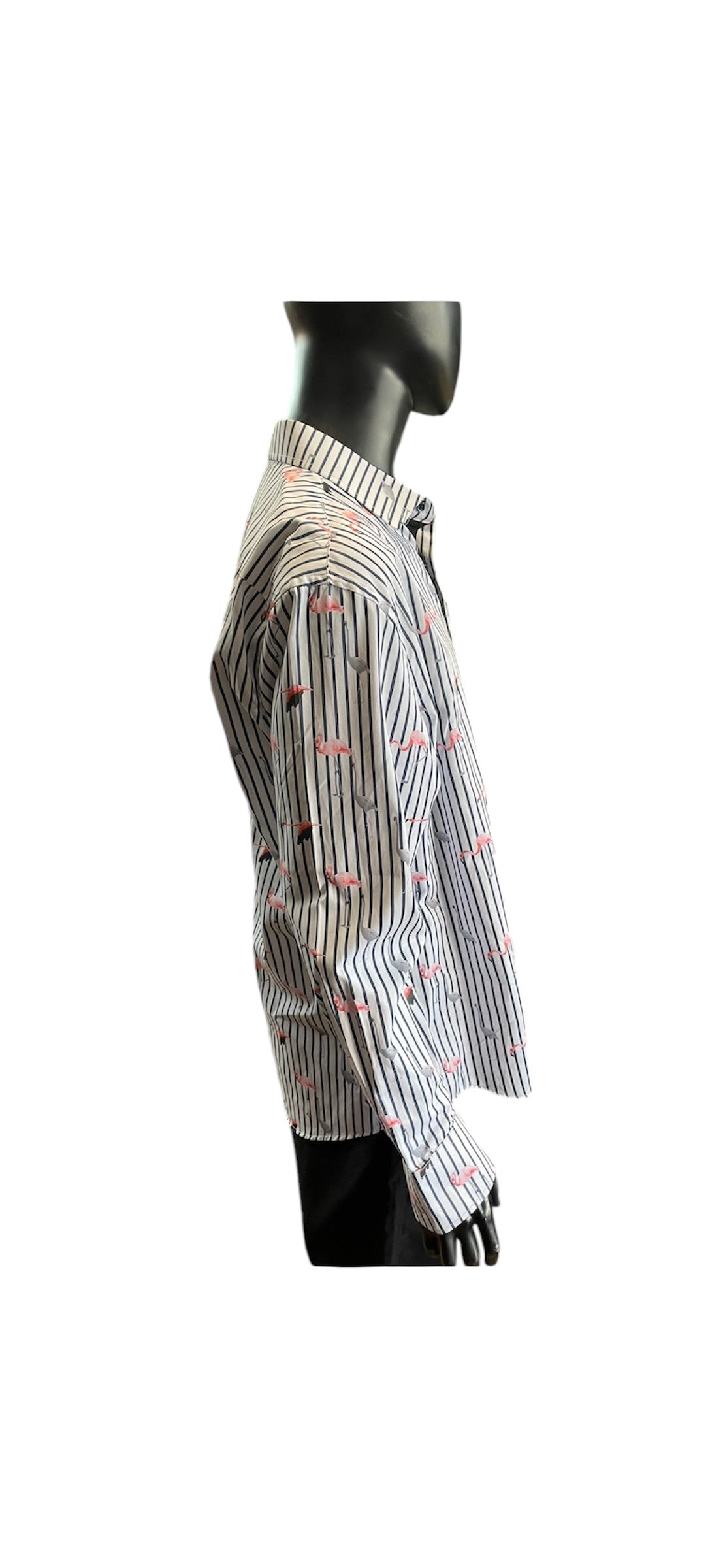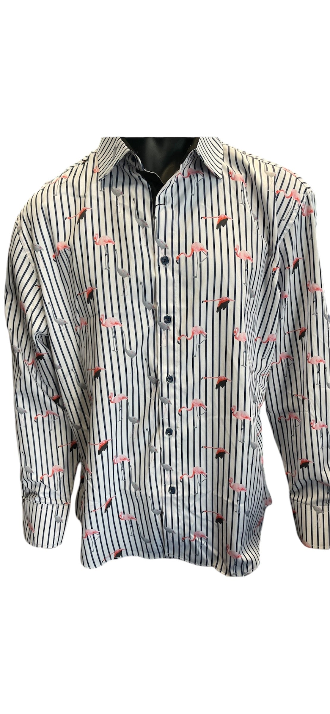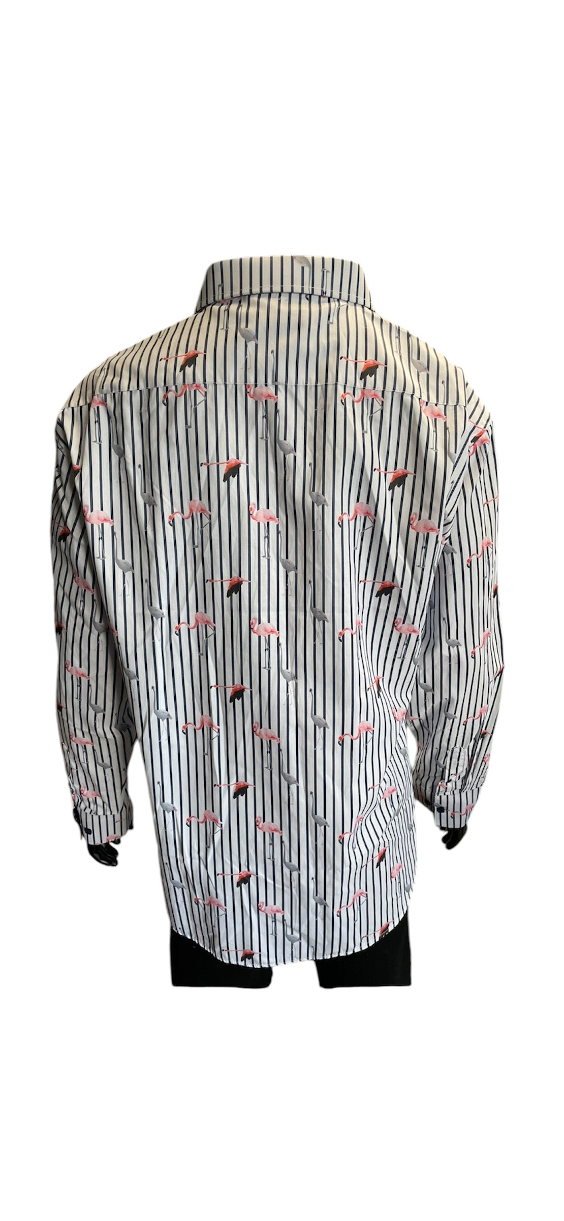 This men's button up dress shirt can be dressed up or down. Shirt with white base, blue pin stripes with flamingos. It does not have a shirt pocket. It also is 100% cotton, and it is a size 3XL. This is a high quality dress shirt. Please make sure to follow the care instructions