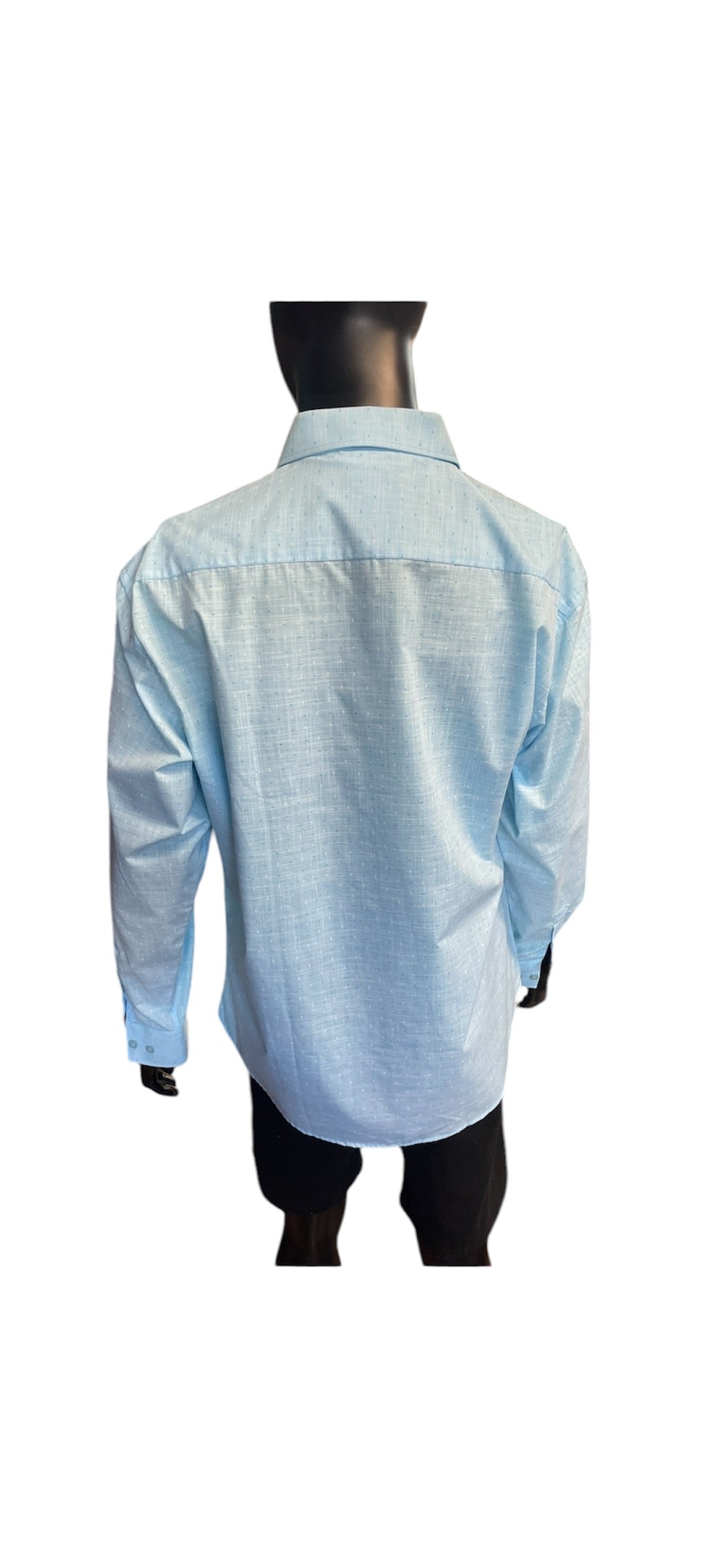 This men's button up dress shirt can be dressed up or down. It does not have a shirt pocket. It also is 100% cotton, and it is a size 2XL. This is a high quality dress shirt. Please make sure to follow the care instructions