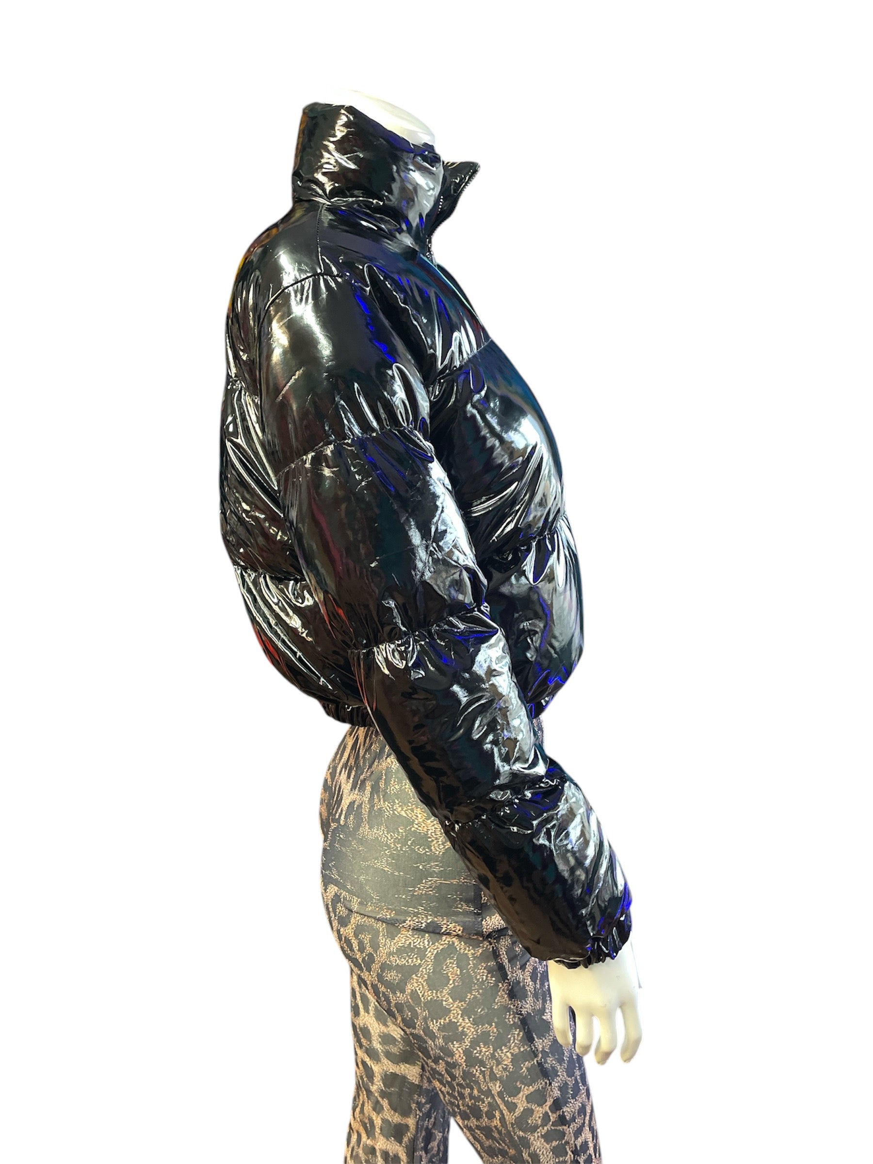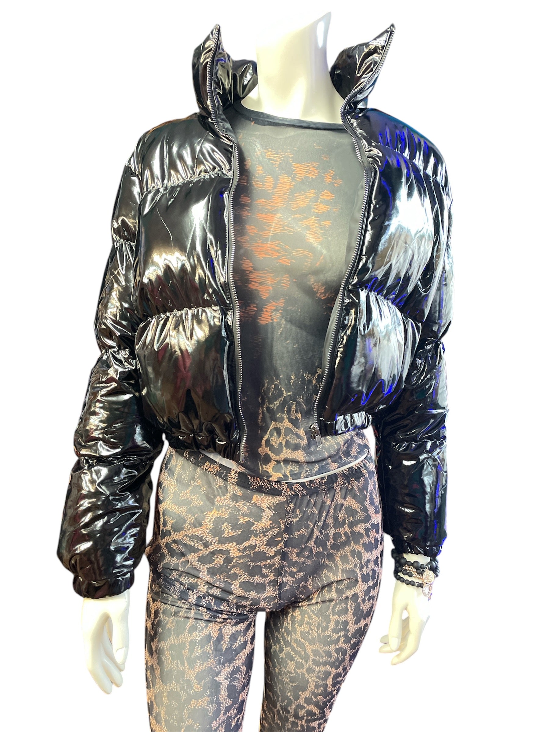 Shiny Black Cropped Long Sleeve Zip-Up Puffer Jacket. Cute and soft puffer jacket. High neck/collar. fitted and cropped at the waist. No pockets.