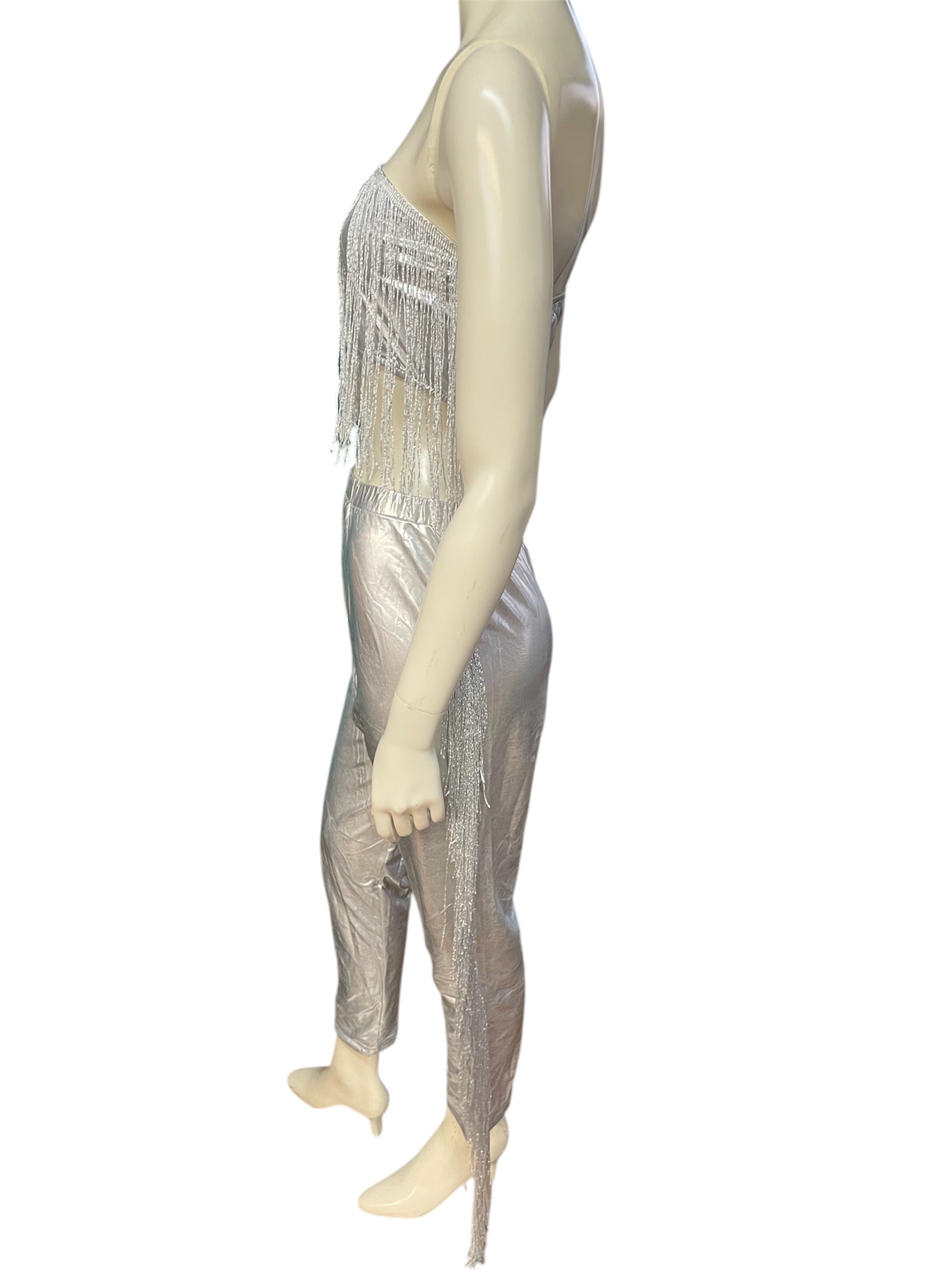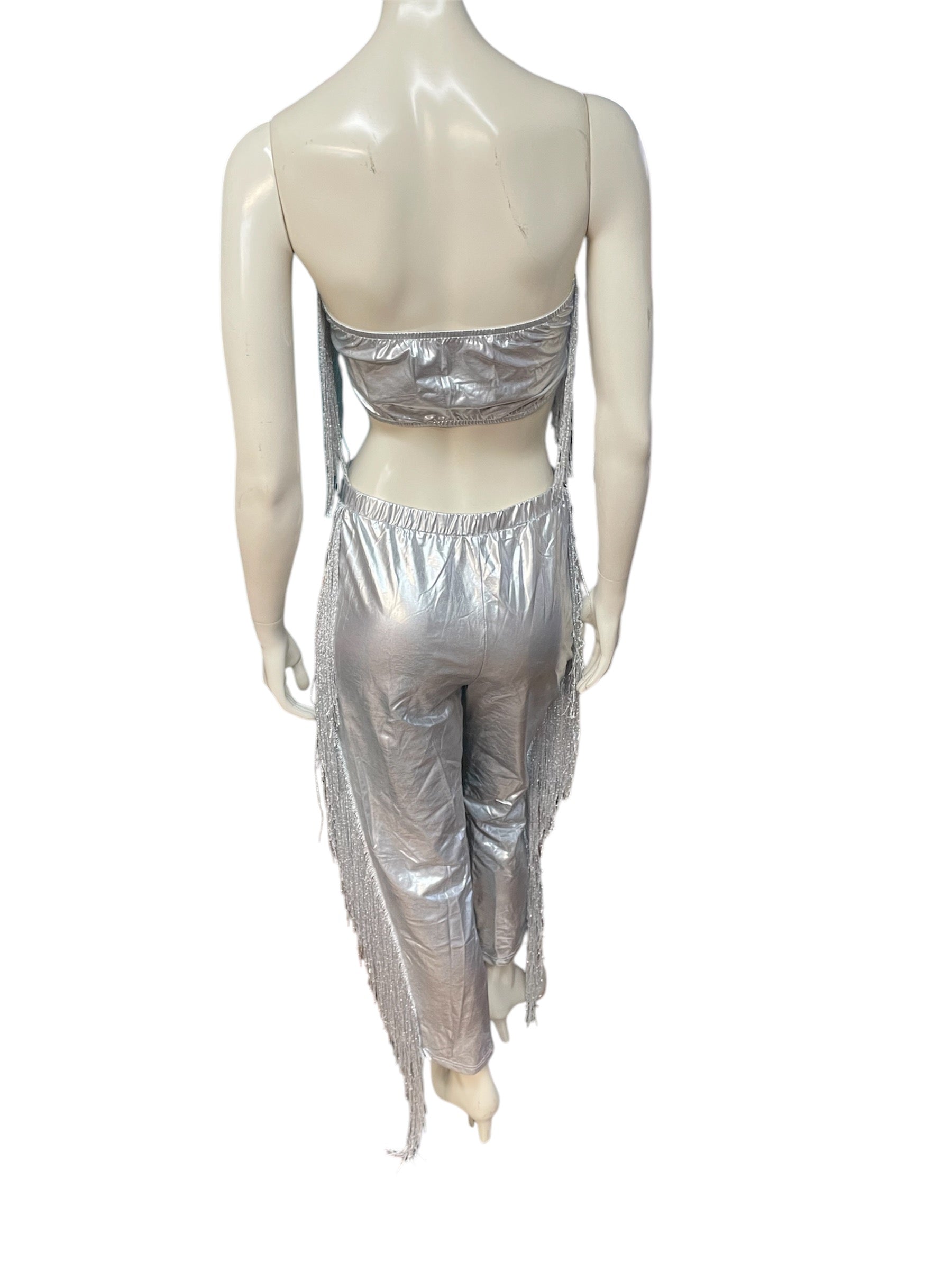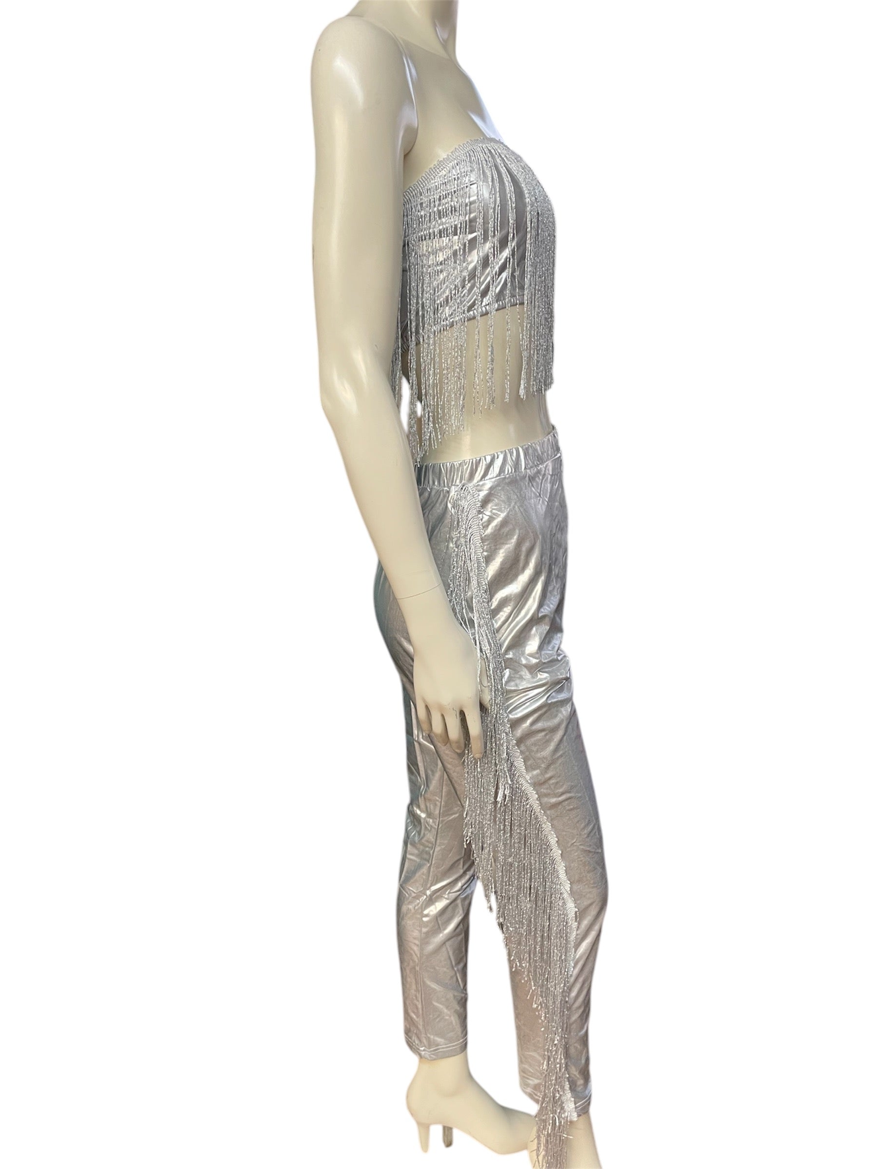 Sexy and Classy Silver 2 Piece Fitted Bandeau and Pants Leather Tassel Set