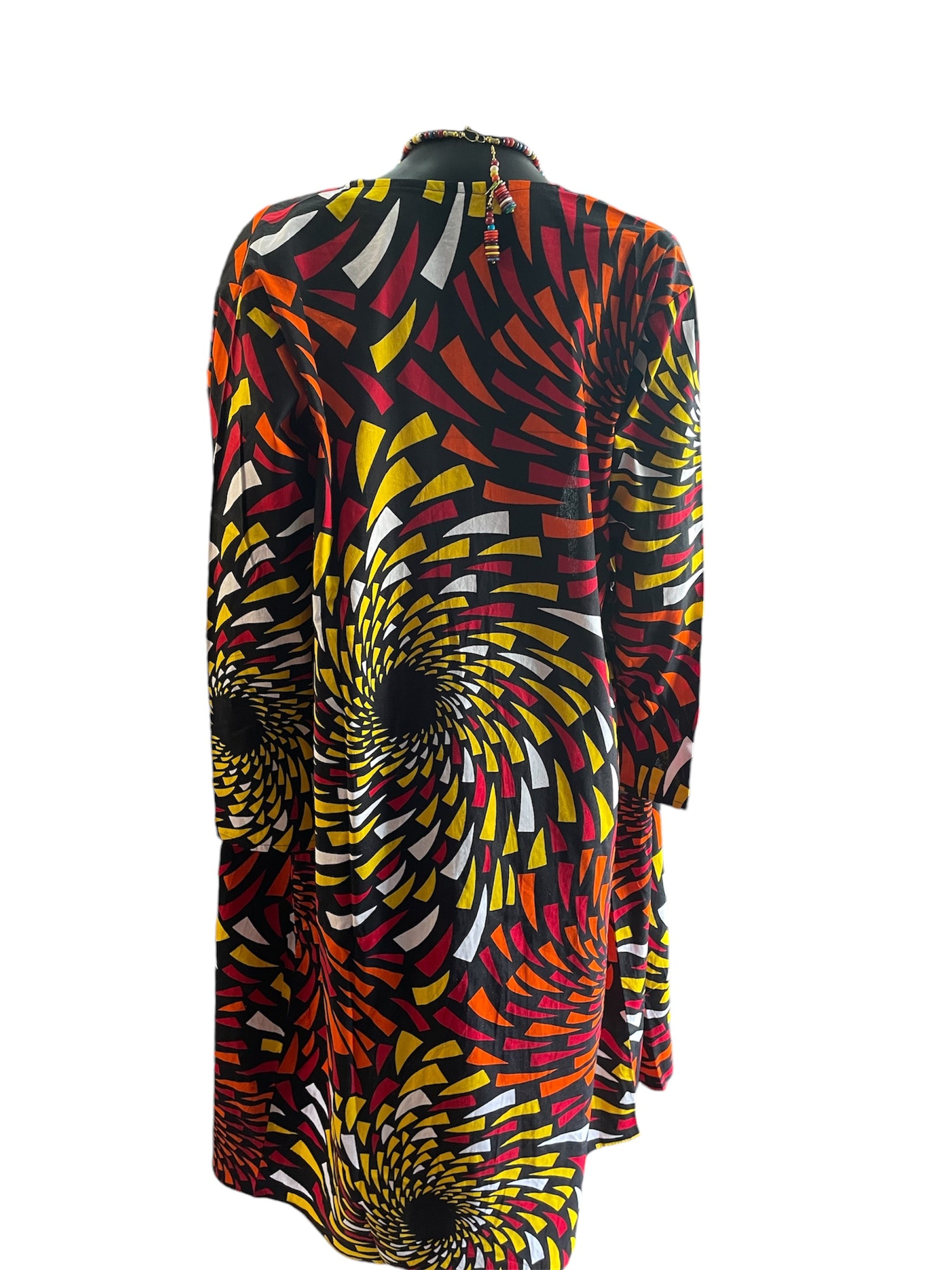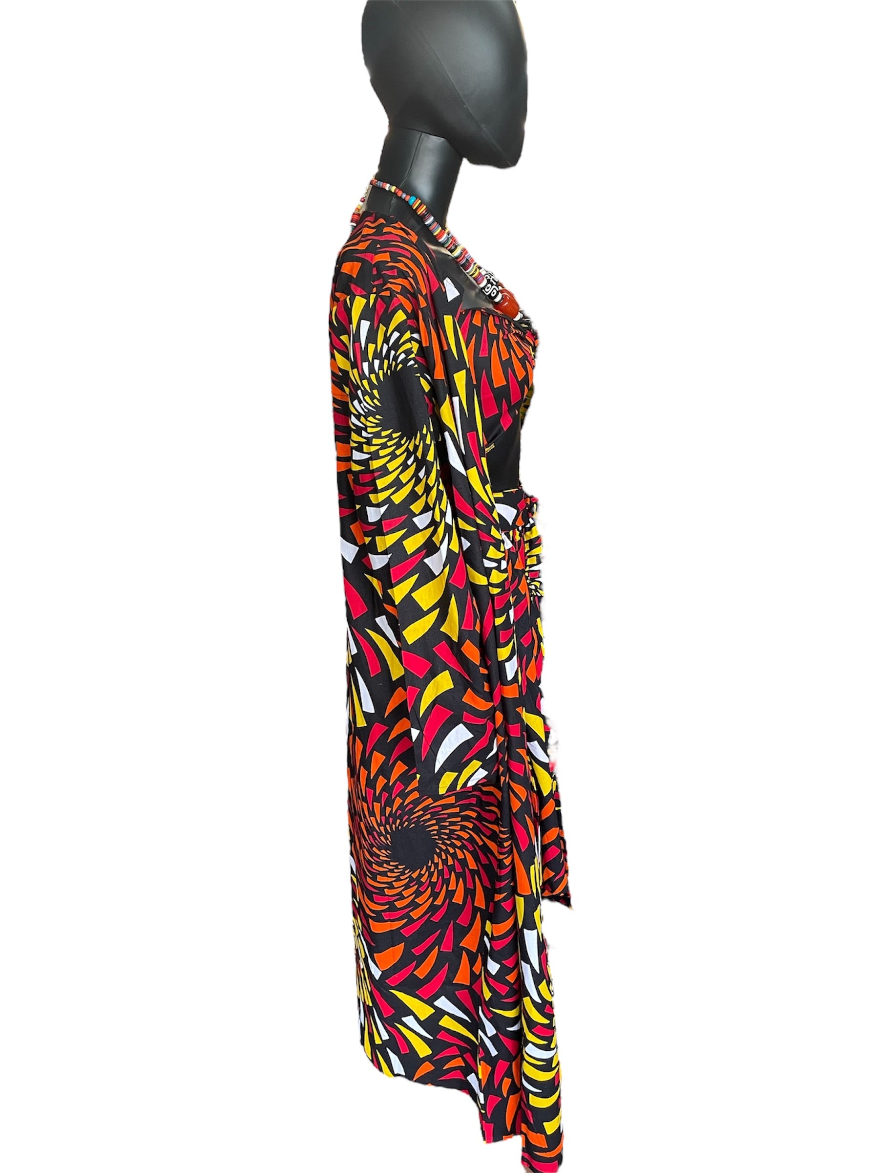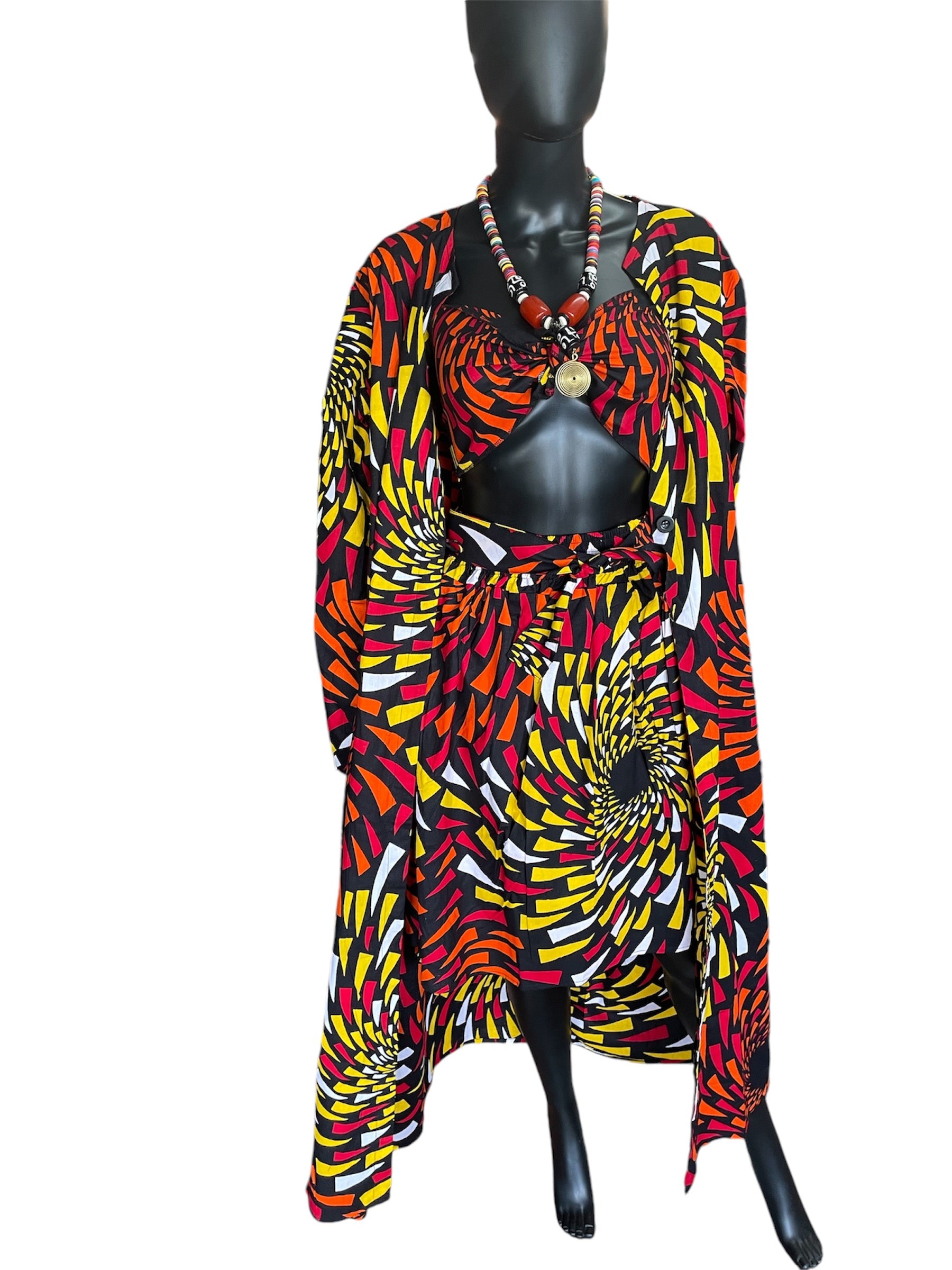 A pretty and unique 3 piece skirt, head wrap, and duster jacket. The head wrap can be used as a tie crop top as seen in the photo. The skirt has an elastic waist and and also ties at the waist. The jacket has one center button to bring it together.